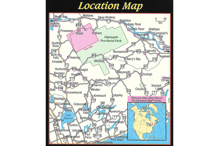 The entire Northwest quadrant of Algonquin is covered on this map. It overlaps the north edge of the Algonquin 1 map and stretches from Kawawaymog Lake outside the west park boundary all the way over to Brent on Cedar Lake. At 1:80,000 scale this map shows more detail than government topos including campsites, portages, historic features and the incredibly detailed land and waterscape you’ve come to expect from The Adventure Map®. The back side is covered with colour photos and text detailing the natural and human history of the area along with suggested routes, safety tips, contact info and much more. As with other Algonquin maps in our series this one has quickly become the standard for on-the-water navigation.