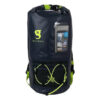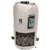 This backpack features a 20L capacity, durable pvc tarpaulin material and a sleeve to store and still use your phone. Have easy access to gear with the outside mesh zip pocket and bungee cords.